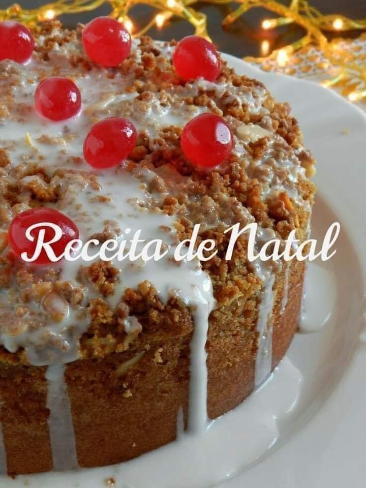 O bolo é fofo e de sabor suave, perfeito para esta crosta super crocante e dourada que se forma com a farofinha e o glacê.