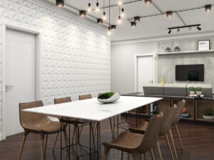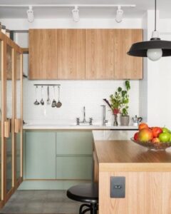 A escolha da cor e tonalidade que a lâmpada emite é fundamental para cada tipo de espaço. Por exemplo: Na cozinha onde precisamos de uma boa iluminação para o preparo dos alimentos e limpeza, sempre utilizamos as lâmpadas de Led de 6500K, ou seja, luz branca. São ideais para cozinhas, banheiros e área de serviço onde precisamos ter uma visão clara. Você pode trabalhar com trilhos que podem ser instalados mesmo sem o rebaixo de forro de gesso.