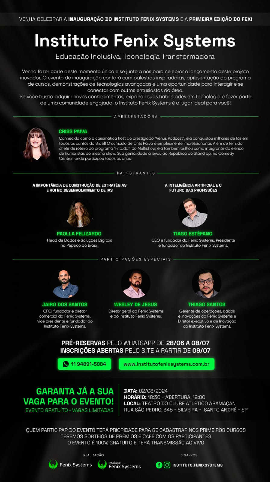 Hoje dia 04 de julho, o visionário fundador e CEO, Tiago Estéfano, estará ao vivo em um podcast especial para compartilhar tudo sobre a incrível iniciativa beneficente do Instituto Fênix Systems! 🚀