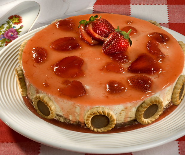 4 – Retire a torta da geladeira, desinforme, decore por cima com a calda de morango e as laterais com biscoito recheado e sirva a seguir.