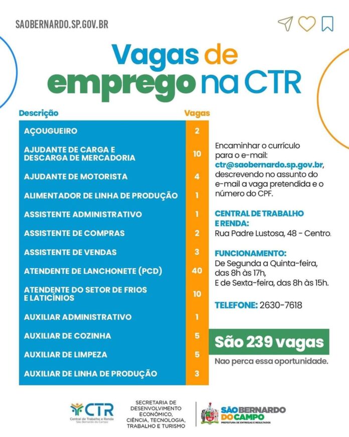 ✉Envie o seu currículo para o e-mail: ctr@saobernardo.gov.br descrevendo no assunto a vaga pretendida e o número do CPF.