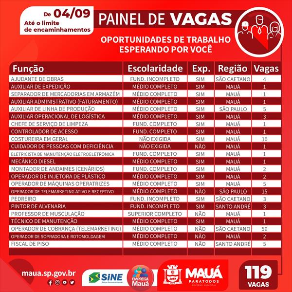 O painel de vagas integra o programa Emprega Mauá, que busca inserir profissionais no mercado de trabalho. As equipes estão em diálogo com empresários e trabalhadores para entender as principais demandas e apresentar ações, visando otimizar a mão de obra e qualificar os trabalhadores para as oportunidades.