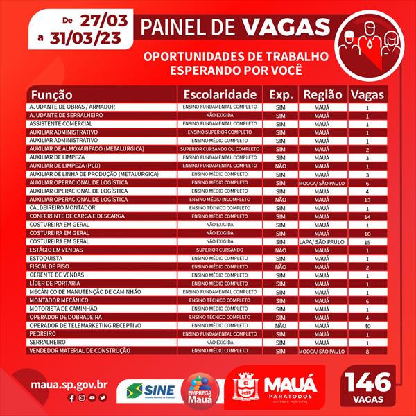 O painel de vagas integra o programa ‘Emprega Mauá’, que busca inserir profissionais no mercado de trabalho. As equipes estão em diálogo com empresários e trabalhadores para entender as principais demandas e apresentar ações, visando otimizar a mão de obra e qualificar os trabalhadores para as oportunidades.