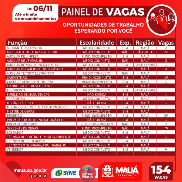 O painel de vagas integra o programa Emprega Mauá, que busca inserir profissionais no mercado de trabalho. As equipes estão em diálogo com empresários e trabalhadores para entender as principais demandas e apresentar ações, visando otimizar a mão de obra e qualificar os trabalhadores para as oportunidades.