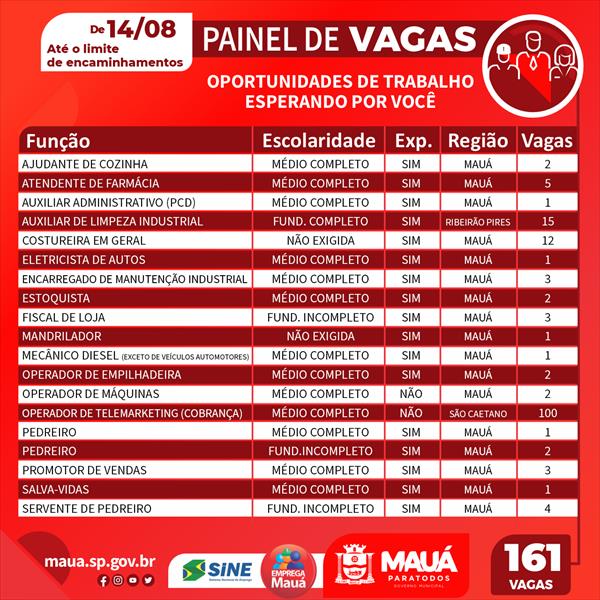 O Centro Público de Trabalho e Renda (CPTR) de Mauá, mantido pela Prefeitura, terá 161 oportunidades profissionais na próxima semana, para empresas em cidades do ABC, inclusive Mauá. O painel é atualizado constantemente.