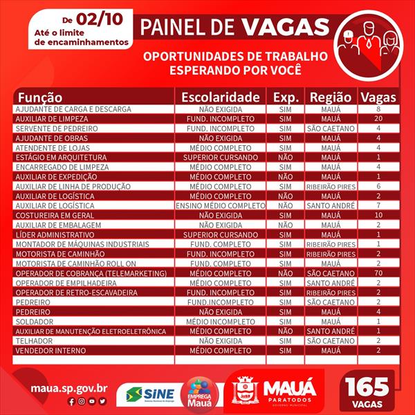 O painel de vagas integra o programa Emprega Mauá, que busca inserir profissionais no mercado de trabalho. As equipes estão em diálogo com empresários e trabalhadores para entender as principais demandas e apresentar ações, visando otimizar a mão de obra e qualificar os trabalhadores para as oportunidades.