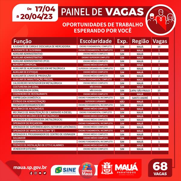 O painel de vagas integra o programa ‘Emprega Mauá’, que busca inserir profissionais no mercado de trabalho. As equipes estão em diálogo com empresários e trabalhadores para entender as principais demandas e apresentar ações, visando otimizar a mão de obra e qualificar os trabalhadores para as oportunidades.