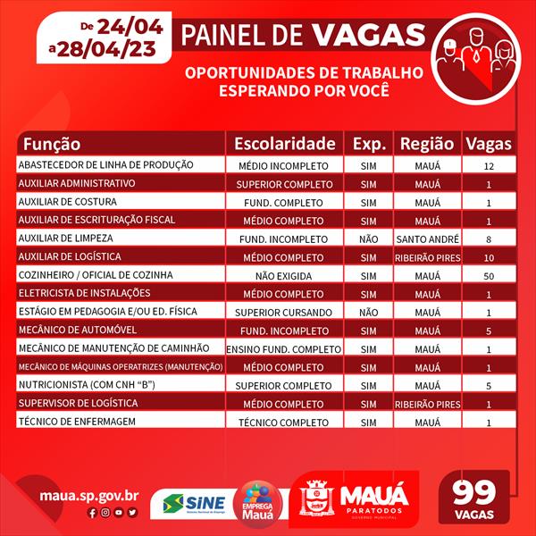 Trabalhadores em busca de recolocação profissional podem comparecer ao CPTR (Centro Público de Trabalho e Renda) de Mauá para se candidatar e concorrer a um novo emprego. O painel da unidade conta com 99 vagas, incluindo empresas da cidade, de Santo André e de Ribeirão Pires. O sistema é atualizado a cada semana.