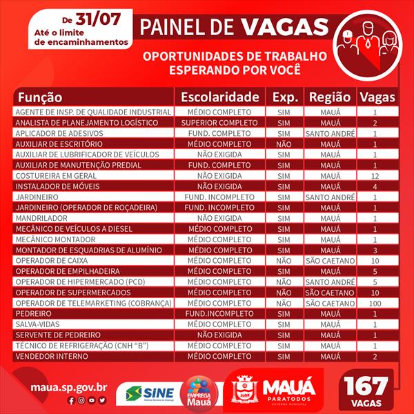 O painel de vagas integra o programa Emprega Mauá, que busca inserir profissionais no mercado de trabalho. As equipes estão em diálogo com empresários e trabalhadores para entender as principais demandas e apresentar ações, visando otimizar a mão de obra e qualificar os trabalhadores para as oportunidades.