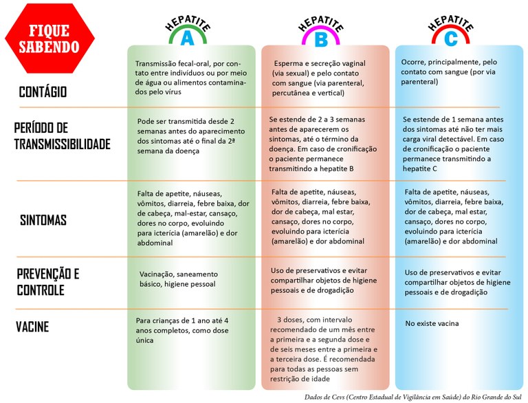 HEPATITES – As hepatites são uma inflamação do fígado. As mais conhecidas são hepatite A, hepatite B e Hepatite C. As duas últimas costumam ser silenciosas e geralmente são descobertas quando já estão em um quadro evoluído, com cirrose ou câncer de fígado (hepatocarcinoma). Caso descoberta antes desse último caso, a hepatite B crônica tem tratamento, mas não cura. O quadro abaixo mostra sobre o contágio, período de transmissibilidade, sintomas, prevenção, controle e vacinação.