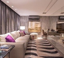 Se a ideia é ampliar o ambiente, escolha modelos em que os móveis fiquem completamente em cima do tapete. Para os menores, sempre deixe os móveis, pelo menos, 20 cm por cima do tapete. Os modelos redondos não precisam seguir essa regra, mas o tamanho deve ser compatível com o cômodo e a disposição dos móveis