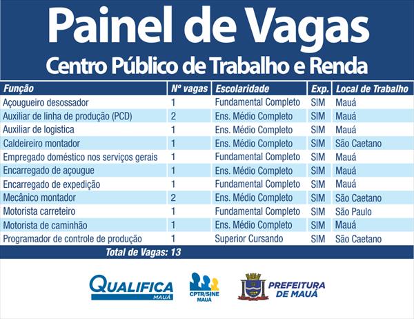 O CPTR (Centro Público de Trabalho e Renda) de Mauá oferece 13 vagas de emprego para a semana entre os dias 10 e 14 de setembro (de segunda a sexta-feira). As empresas contratantes ficam localizadas em Mauá, São Caetano do Sul e São Paulo.