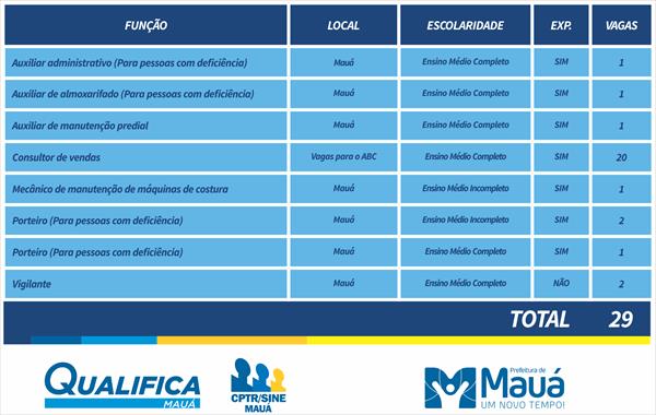 Das 29 vagas disponibilizadas, 26 são reservadas para quem tem o ensino médio completo, sendo 20 para consultor de vendas, duas para vigilante e uma para auxiliar de manutenção predial. Para pessoas com deficiência, as vagas há uma vaga para auxiliar administrativo, auxiliar de almoxarifado e porteiro.