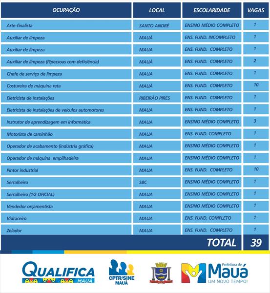O CPTR (Centro Público de Trabalho e Renda) de Mauá oferece 39 vagas de emprego na semana entre os dias 22 e 26 de janeiro (segunda à sexta-feira). As oportunidades são para trabalhar em Santo André, São Bernardo, Mauá e Ribeirão Pires.