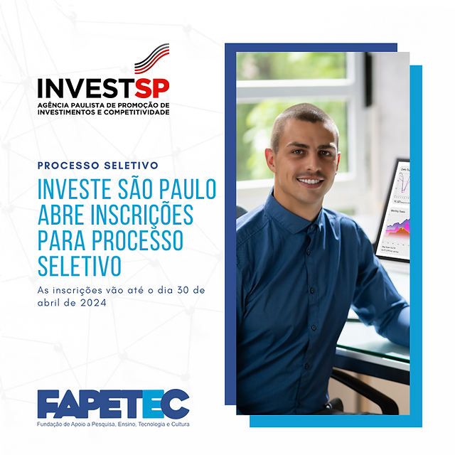 A Agência Paulista de Promoção de Investimentos e Competitividade (InvestSP), vinculada à Secretaria de Desenvolvimento Econômico do Estado de São Paulo (SDE), abriu processo seletivo para a contratação de novos colaboradores, em cadastro de reserva, que vão atuar na cidade de São Paulo. Todas as vagas exigem formação superior, no mínimo seis meses de experiência e algum nível de proficiência em inglês, que varia de acordo com o cargo.
