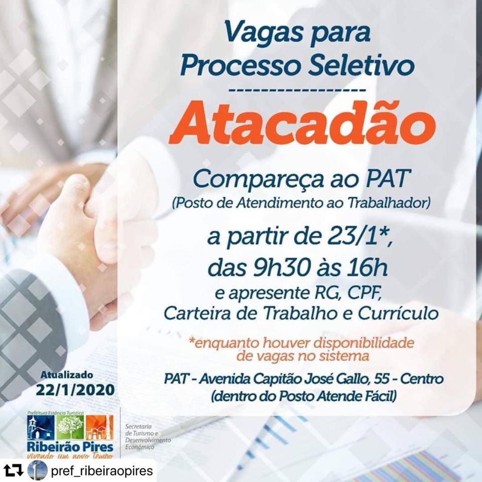 O Atacadão está com 200 vagas abertas para profissionais de diversas áreas na loja de Ribeirão Pires, que será inaugurada em março. Os postos são para fiscal de prevenção de perdas, auxiliar de informática, operador de caixa, repositor, auxiliar de depósito e auxiliar de cozinha.
