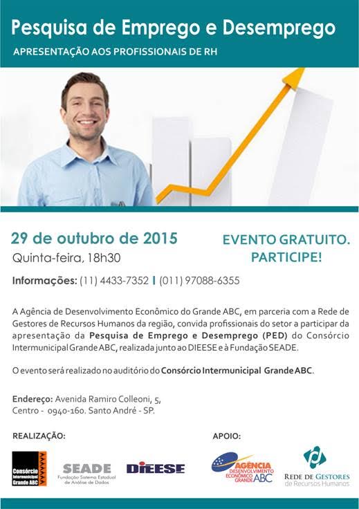 A Agência de Desenvolvimento Econômico do Grande ABC em parceria com a Rede de Gestores de RH, convida profissionais do setor a participar da apresentação da PESQUISA DE EMPREGO E DESEMPREGO (PED) do Consórcio Intermunicipal do Grande ABC, realizada junto ao DIEESE e a Fundação SEADE.