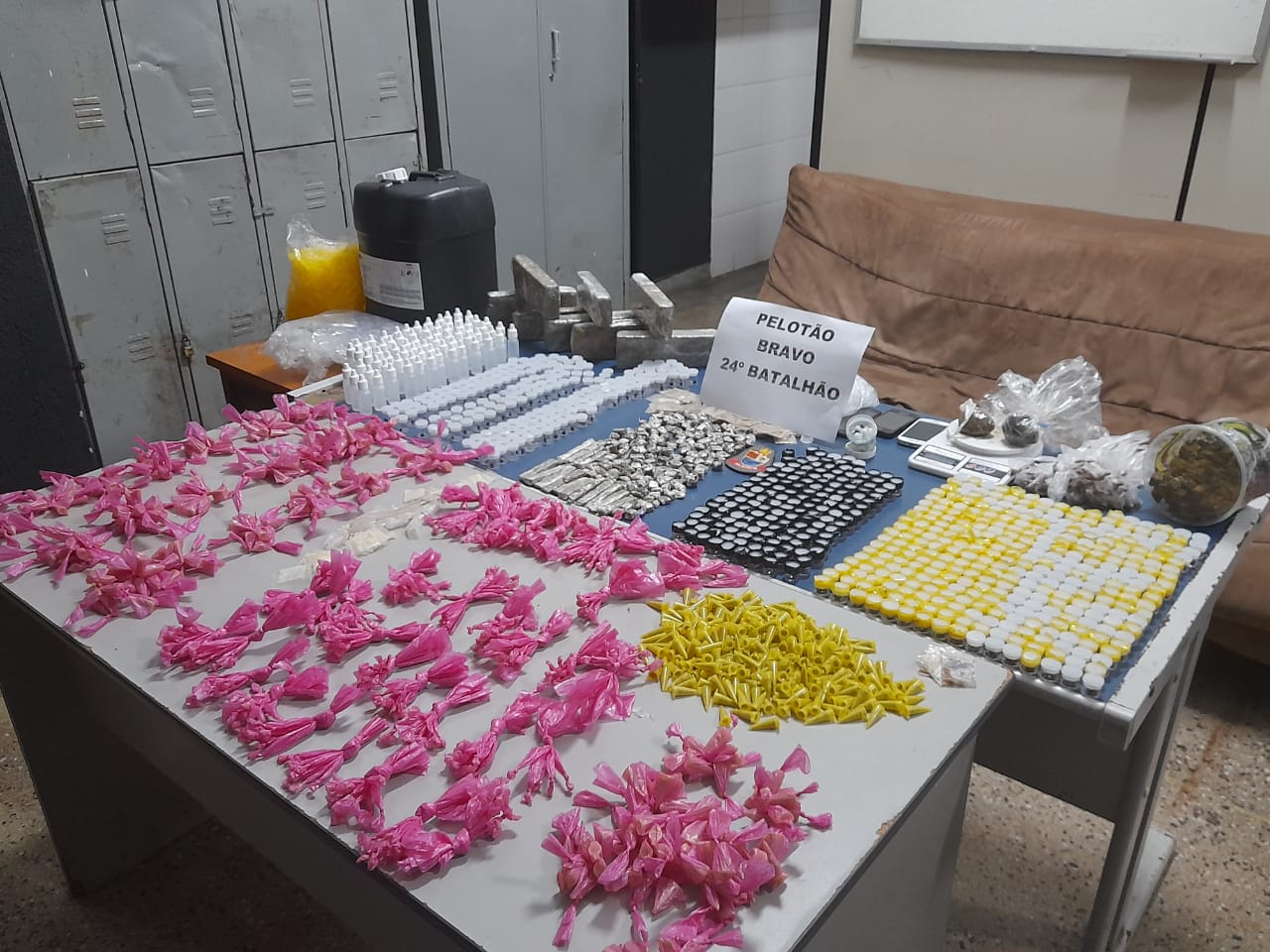 - Ao adentrarem na residência, localizaram várias faixas de gases para curativos com manchas de sangue, balança de precisão, aparelhos celulares e diversos tipos de drogas, totalizando: 670 porções de K2, 460 porções de skank, 330 porções de crack, 205 porções de haxixe, 170 porções de maconha, 08 tijolos de maconha, 15 porções de cocaína, 72 francos de lança-perfumes, 01 galões com 15 litros de lança-perfumes e 01 frascos, contendo diversos comprimidos. Ocorrência apresentada no 1⁰ Distrito Policial do município, onde os objetos e entorpecentes foram apreendidos.📝Com Informações da Seção de Comunicação Social 24º BPM/M