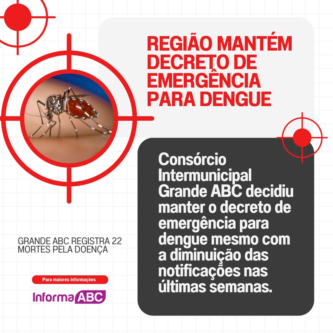 O Consórcio Intermunicipal Grande ABC decidiu manter o decreto de emergência para dengue mesmo com a diminuição das notificações nas últimas semanas. A decisão foi anunciada nesta terça-feira (14) em assembleia geral e contempla as cidades de Santo André, Diadema, Mauá, Ribeirão Pires e Rio Grande da Serra. Desde o início deste ano, a região contabiliza 22 mortes e 20.324 casos confirmados da doença, segundo a Secretaria de Saúde do Estado.