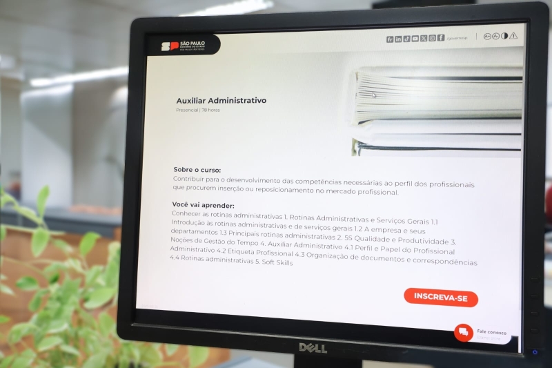 O curso de auxiliar administrativo tem carga horária de 78 horas, período em que o aluno vai receber informações sobre as rotinas administrativas; a organização da empresa e seus departamentos; sobre qualidade e produtividade; gestão do tempo; o perfil e o papel do profissional administrativo; etiqueta profissional; organização de documentos e correspondências e soft skills (conjunto de competências sociais, emocionais e mentais que influenciam o comportamento de pessoa, especialmente no ambiente de trabalho). O acesso direto para inscrições é https://www.alunos.cettpro.sp.gov.br/meu-primeiro-emprego/cursos/40740626-352f-f011-8c4e-000d3ac13d30.
