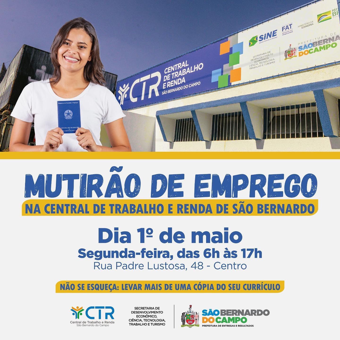 Em proposta adicional para fomentar a geração de novas oportunidades na cidade, a Prefeitura de São Bernardo, governada por Orlando Morando, irá promover nesta segunda-feira (1º/5) Mutirão do Emprego, em homenagem ao Dia do Trabalho. A iniciativa será realizada nas dependências da CTR (Central de Trabalho e Renda), das 6h às 17h, com mais de 800 vagas de emprego disponíveis à população.