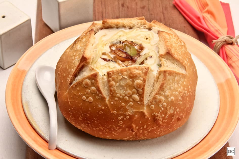Corte uma tampa no pão e retire o miolo com ajuda de uma faca. Despeje a sopa dentro do pão e polvilhe com queijo e, se desejar, com cebola caramelizada. Sirva.