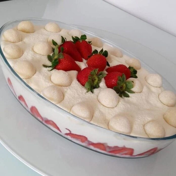 Em uma travessa coloque um pouco do creme de ninho, os morangos picados em volta e uma camada de bolo.