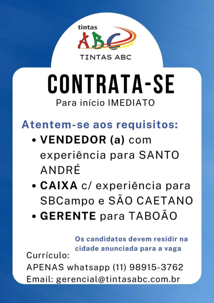 Para enviar currículo: gerencial@tintasabc.com.br