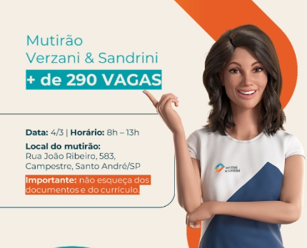 A Verzani & Sandrini, empresa líder no setor de segurança e facilities no país, realiza na próxima segunda-feira, 04 de março, das 8h às 13h, um mutirão de emprego em Santo André para preencher 290 vagas, disponíveis em todas as regiões de São Paulo e ABC.