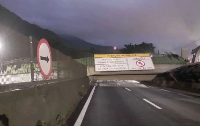 Um caminhão colidiu com a passarela de pedestres no km 52 da via, sentido Santos, causando danos à estrutura, que caiu sobre ambos os sentidos das pistas. A concessionária informou que não houve vítimas.
