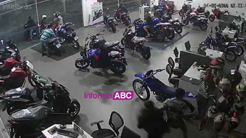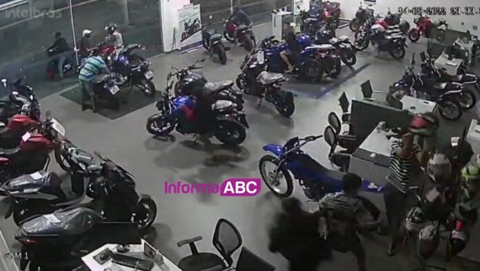 Pelo menos dez pessoas invadem a concessionária e, em poucos instantes, escolhem as motos e fogem com os veículos.